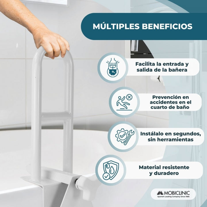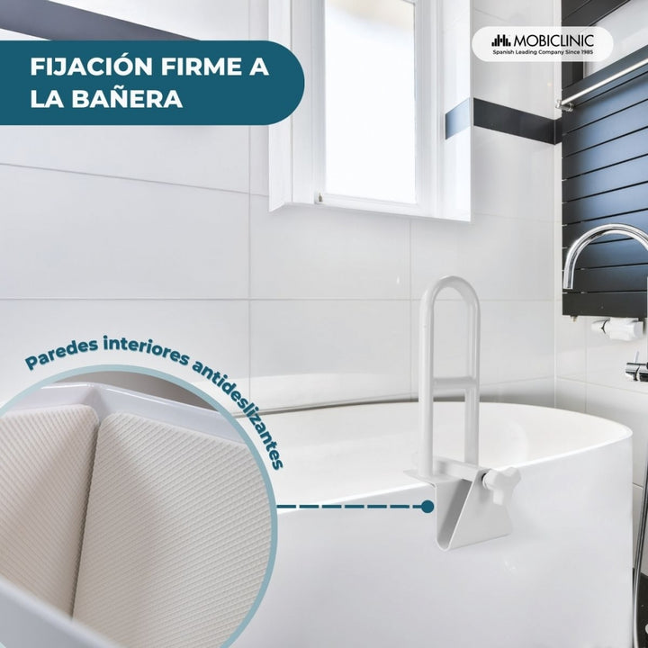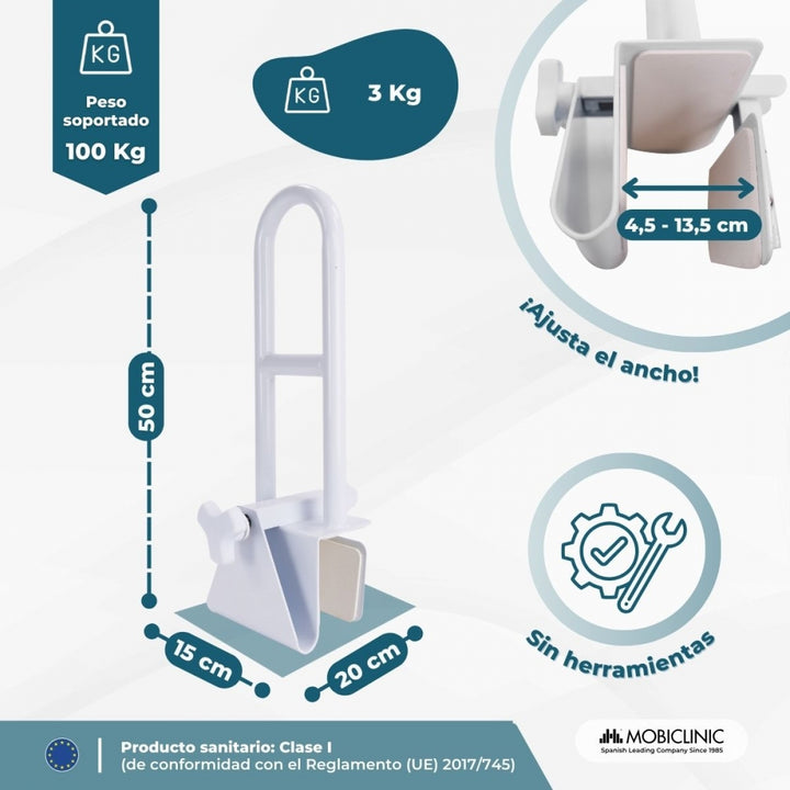 It fits bathtubs with smooth, flat edges, with a minimum width of 4.5 cm and a maximum of 13.5 cm, adapting to different bathtub models. Its ergonomic handle allows for a firm and secure grip, even with wet hands. It stands out mainly for its robust design, capable of supporting up to 100 kg, and is perfect for both clinical and home use.