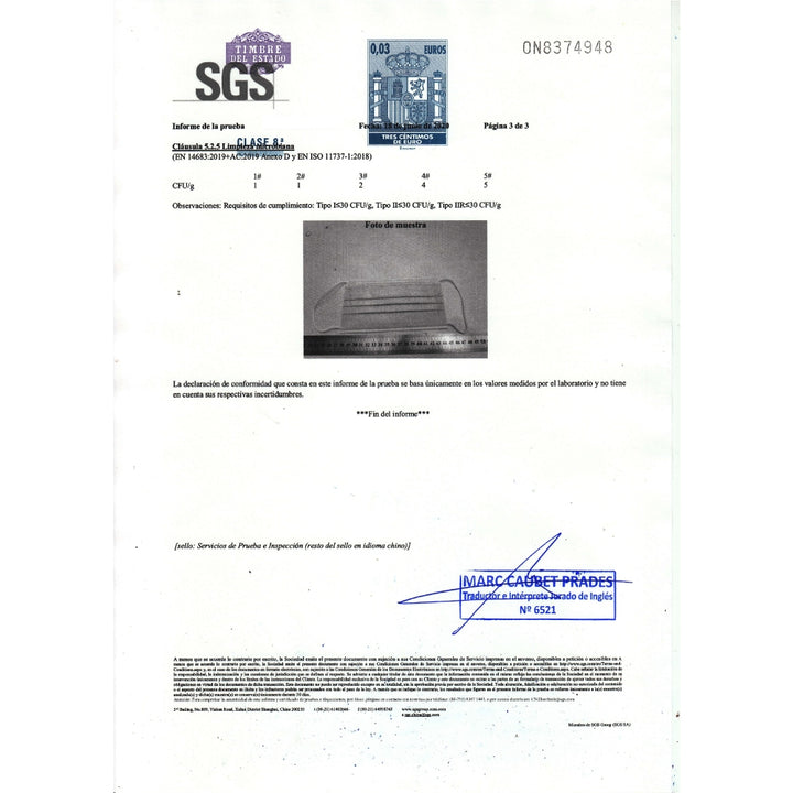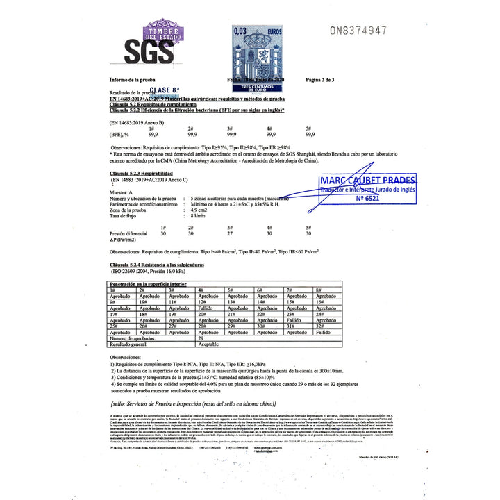 The surgical disposable mask type IIR has a bacterial filtration efficiency of more than 98%. Manufactured in accordance with Directive 93/42/EEC on medical devices according to EN 14683:2019+AC:2019. Test Report approved by SGS and CE marked.