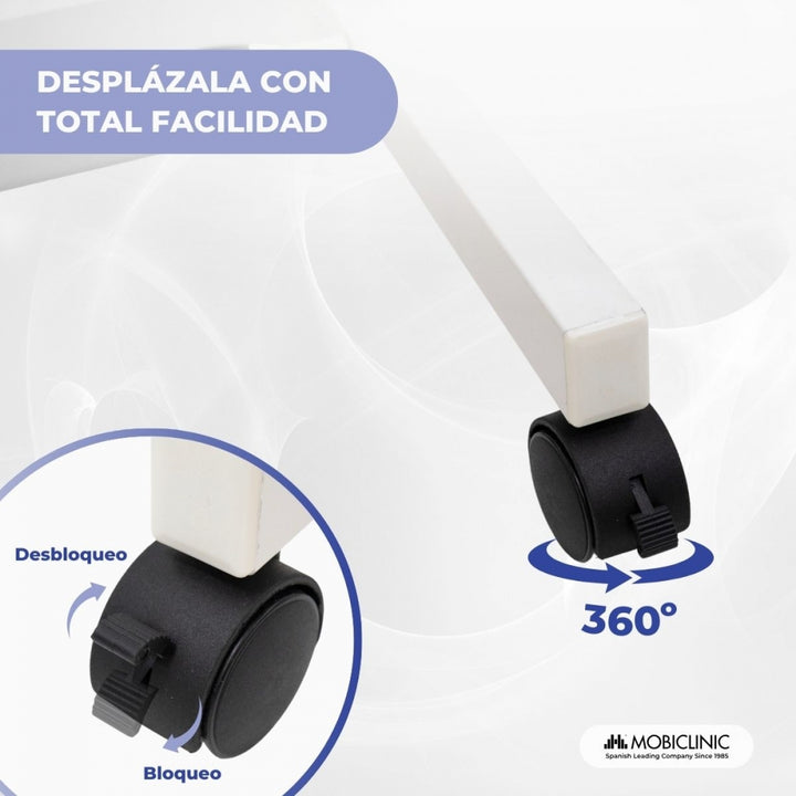 For mobility, it features four swivel casters for easy movement. Two of them include brakes to lock and secure the unit in the desired position, preventing unwanted slipping during use. Its robust steel frame ensures greater strength and stability, supporting a maximum weight of 15 kg.