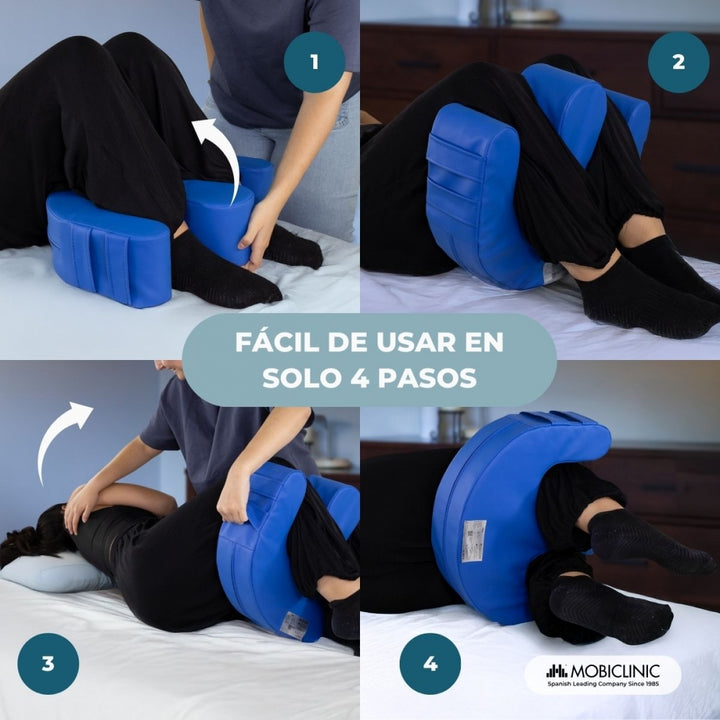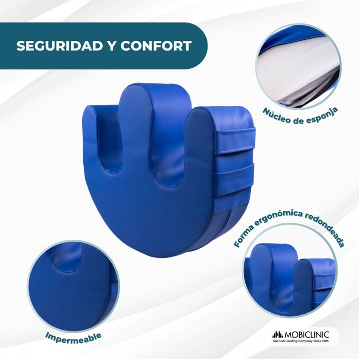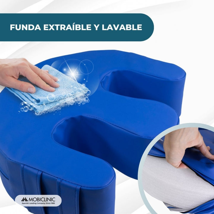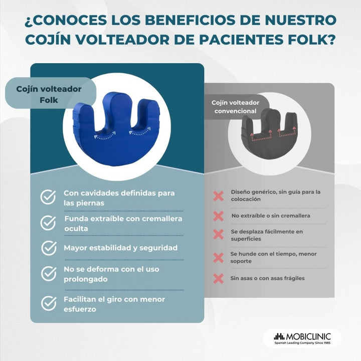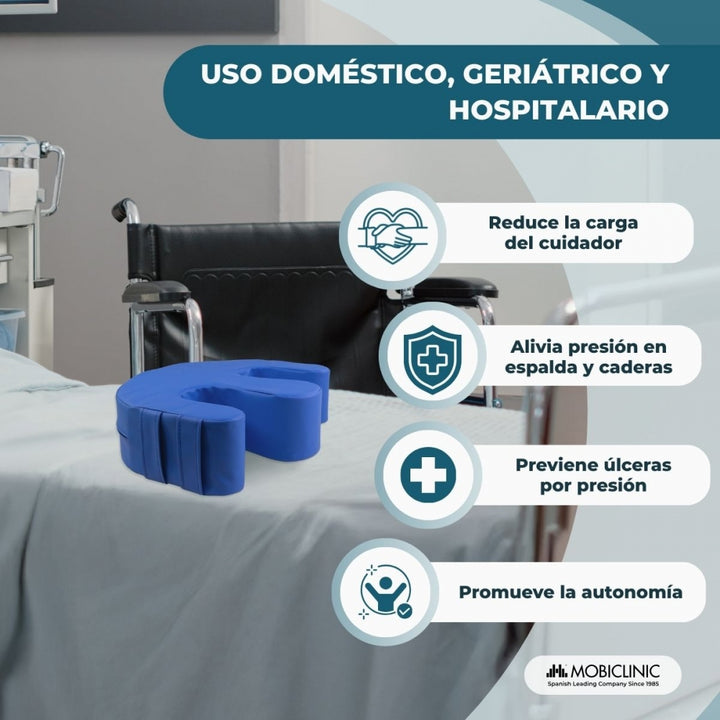The Mobiclinic® Folk turning cushion has been designed to improve care for bedridden patients, facilitating postural changes with complete comfort and safety. Its U-shape with a rounded leg separator and two ergonomic side handles allow the caregiver to reposition the patient effortlessly, reducing physical strain and improving the effectiveness of daily care.