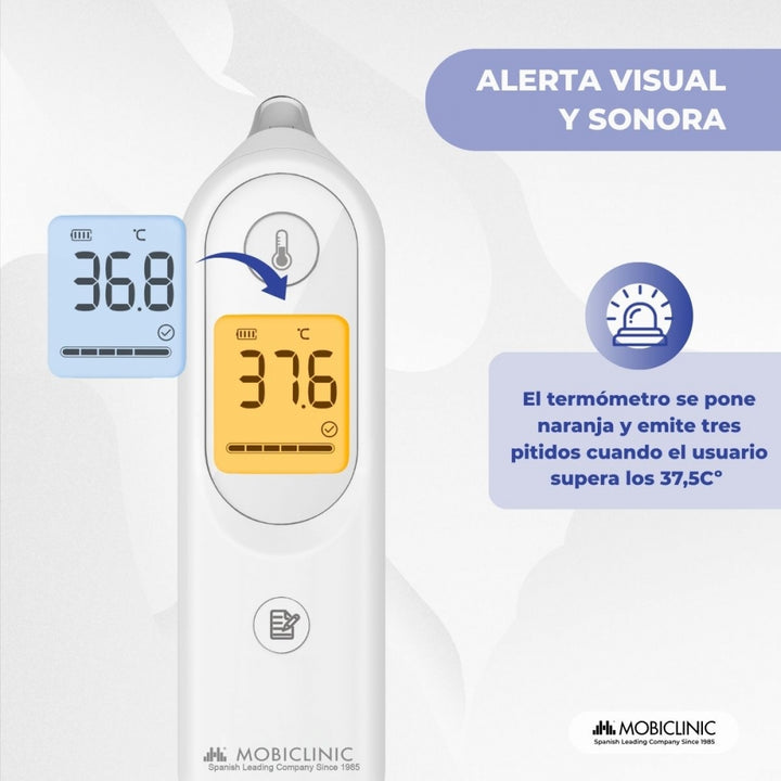 Its soft, molded tip is designed for safe use in the ear. It features an intelligent alert system that detects if the temperature exceeds 37.5°C and emits a long beep followed by three short ones, along with the orange display, clearly and quickly alerting the user. Another great advantage is its built-in memory, which stores the last 7 measurements, allowing monitoring to monitor progress in cases of prolonged fever.