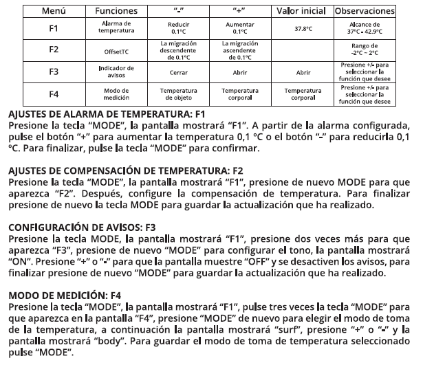 This thermometer is capable of recording body temperatures between 32º and 42.9º. It also features an alarm function that alerts in case of fever (if the patient's temperature is equal to or higher than 38º.)