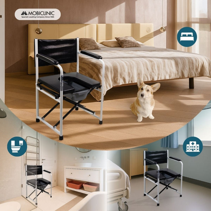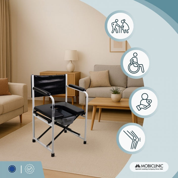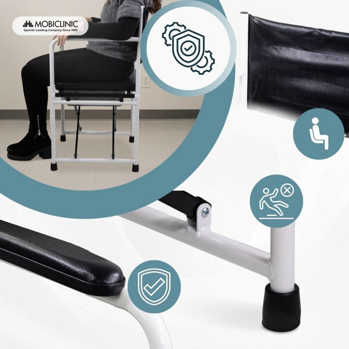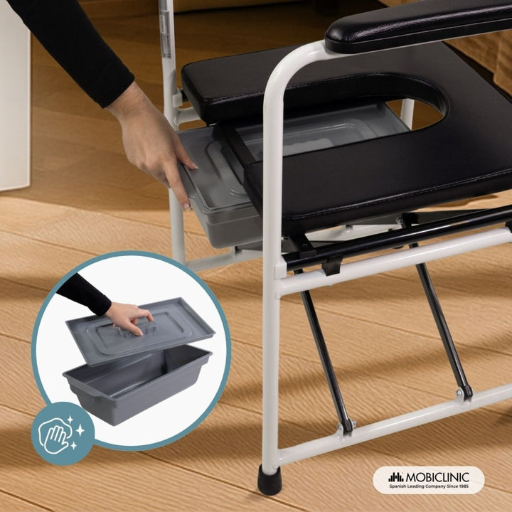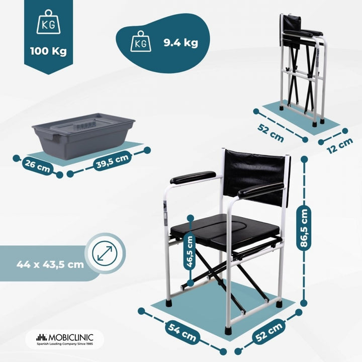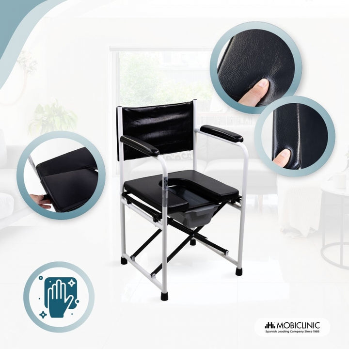 Its resistant structure is made of steel and its upholstery is made of a black padded material which is incredibly easy to clean. This WC chair features comfortable padded armrests and its size and ability to fold makes it suitable for all types of spaces.