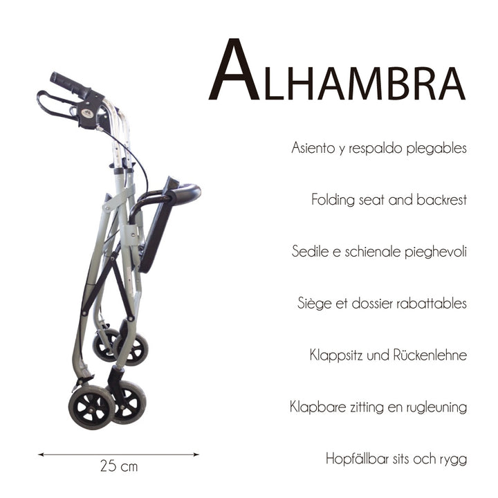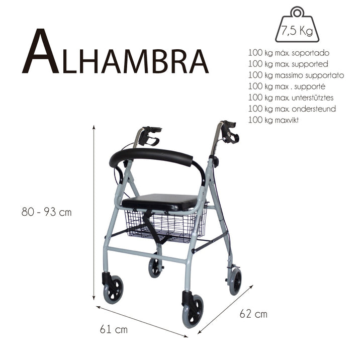 The Alhambra walker has an innovative and lightweight design that offers excellent mobility and stability while walking. It will become a faithful companion in your displacements.nnImproving the mobility of a person with mobility problems improves their self-esteem and quality of life. nnThis walker for adults is a quality solution at the best price with the following features: nnAluminium structure with excellent resistance and lightness. nWith 4 wheels designed to comfortably overcome the small obstacles of the road surface both indoors and outdoors. nErgonomic handle reduces fatigue during use. Includes soft-activated brakes in the handle to stop the walker at the right time and without effort. You also have the possibility of leaving the brakes locked to ensure the immobilization of the walker when sitting or leaning. nPadded seat, manufactured to ensure comfort and safety. It has a fantastic pocket to keep what you want under the seat. nPadded backrest, allows a complete rest in your walker, essential to replenish forces. nIncludes basket, ideal for storing your belongings safely while you walk. You can position it both under the seat and at the front of the walker. nnTechnical characteristics of the folding walker: nn Overall width (including wheels): 61cm n Folded width: 20cm n Seat width: 35,5cm n Solid Wheelsn PVC Radiosn Diameter of front and rear wheels: 14,5cm n Walking height:81-93cm n Length of walker: 59cm n Seat length: 32 cm n Height to seat: 56cm n Maximum weight: 100Kg n Weight of the walker: 7,05Kg n Height of the backrest with respect to the seat: 20cm n Backrest width: 44cm n Height x width x length of basket: 15,5x38x23,5 cmnnWe like this 4-wheeled walker for:nn Its strength and durability. Thanks to its sturdy structure you can enjoy this walker without worrying about anything.n The safety and autonomy that brings to the user. Its stability and pressure brakes on the handle guarantee a safe and quiet ride.n Lightweight and comfortable to wear and store. In addition, thanks to its front basket and rear bag, shopping or transporting objects is not a problem. The Alhambra walker has an innovative and lightweight design that offers excellent mobility and stability while walking. It will become a faithful companion in your displacements.