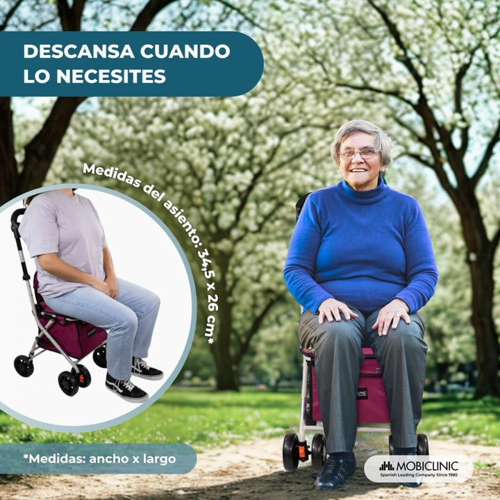 This shopping cart also features a comfortable, sturdy, padded seat so you can rest while strolling or waiting in long lines at the market. It also has a backrest for back relaxation and a removable, waterproof, washable shopping bag that supports up to 5 kg. The Coliseo shopping cart is a single-lever cart, allowing the user to use it with one hand, for example, while walking their grandchild or dog. It is also height-adjustable , with three positions: 86.5 cm, 91.5 cm, and 96.5 cm , allowing it to be adapted to the user's height and maintaining a comfortable and ergonomic posture during use.