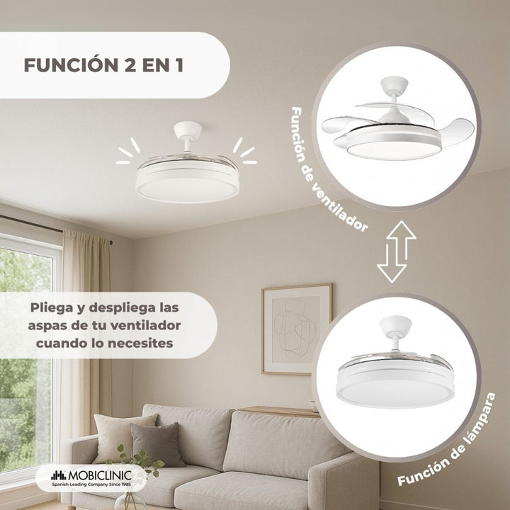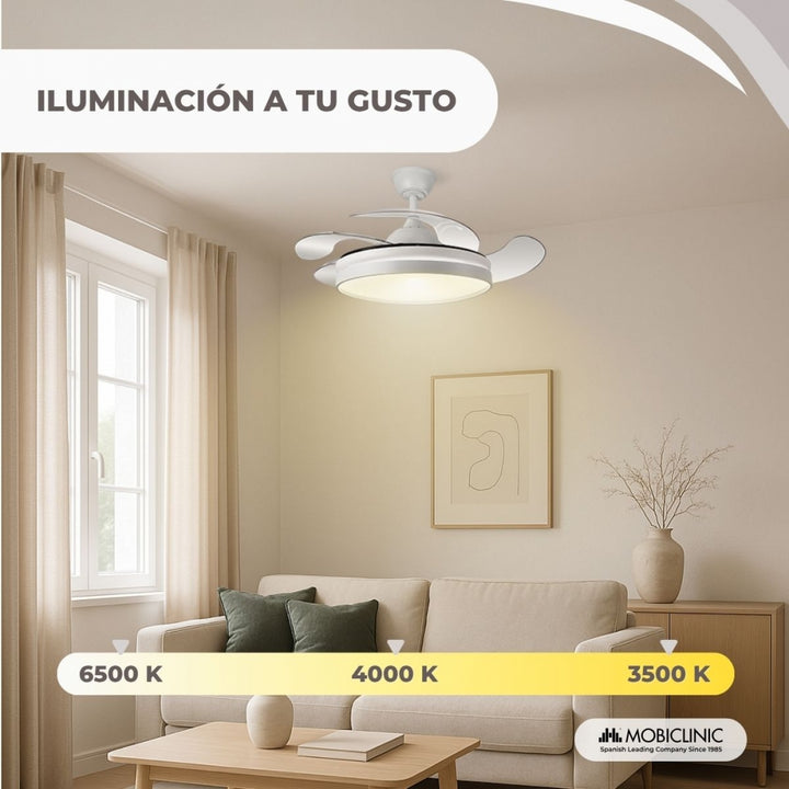 Su diseño incluye 3 modos de iluminación regulables: blanca, cálida y neutra, de 45W garantizando una iluminación perfecta para cualquier momento. Su mando a distancia facilita el control de toda las funciones, tales como regular la velocidad, modificar la luz y ajustarla o apagar y encender el ventilador. Además, incluye un temporizados programable de 2 a 4 horas, permitiendo que su apagado se produzca automáticamente, ahorrando energía y garantizando tranquilidad a los usuarios.