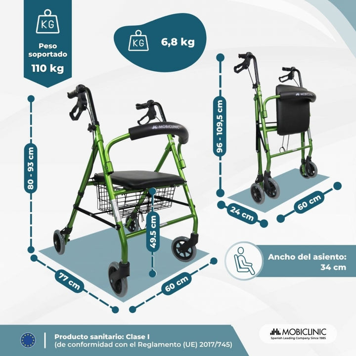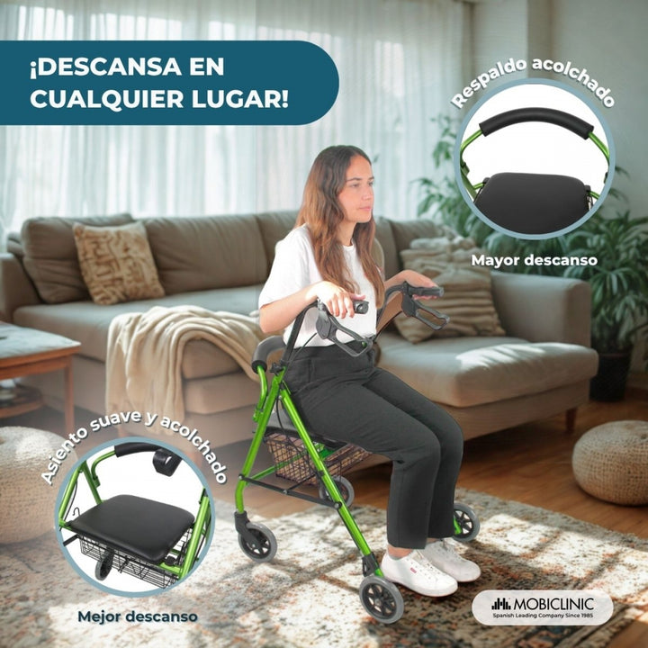 It is a walker for adults with an innovative and lightweight design, which offers excellent mobility and stability while walking. It provides great resistance and agility in movement, because it is made of aluminum. Its four solid wheels are designed to comfortably overcome small obstacles on the ground, both indoors and outdoors, without any risk of punctures.
