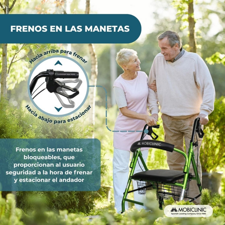 The handles of the walker with a seat are ergonomic, helping to distribute and cushion the weight and reducing fatigue during use. In addition, they include smooth activation brakes to stop the walker at the desired moment and without effort. It can also be locked to ensure the immobilisation of the walker, for example, when sitting on the seat. If the walker needs to be completely immobilised, just pull down the brake handles and the wheels will be locked.