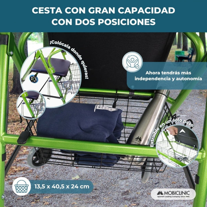 This aluminium walker has a padded seat and backrest to ensure comfort and safety, as well as adequate rest after exertion. It includes a basket designed to store your belongings safely and comfortably while you walk. It can be positioned either under the seat or at the front of the walker.