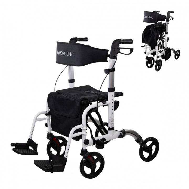 - Includes: folding footrests, reversible backrest, safety brakes, shopping bag and cane holder