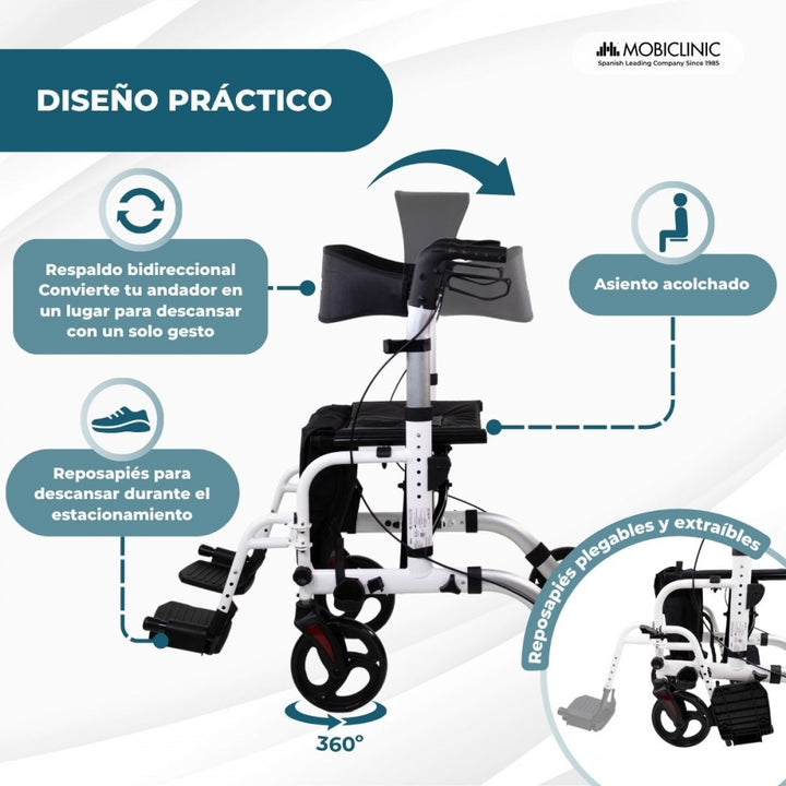 It features a padded seat and a reversible backrest that can be positioned forward or backward, providing comfortable support during breaks. Its 5-level folding footrests allow you to rest your legs safely and conveniently, always complementing rest and without replacing the use of a wheelchair.
