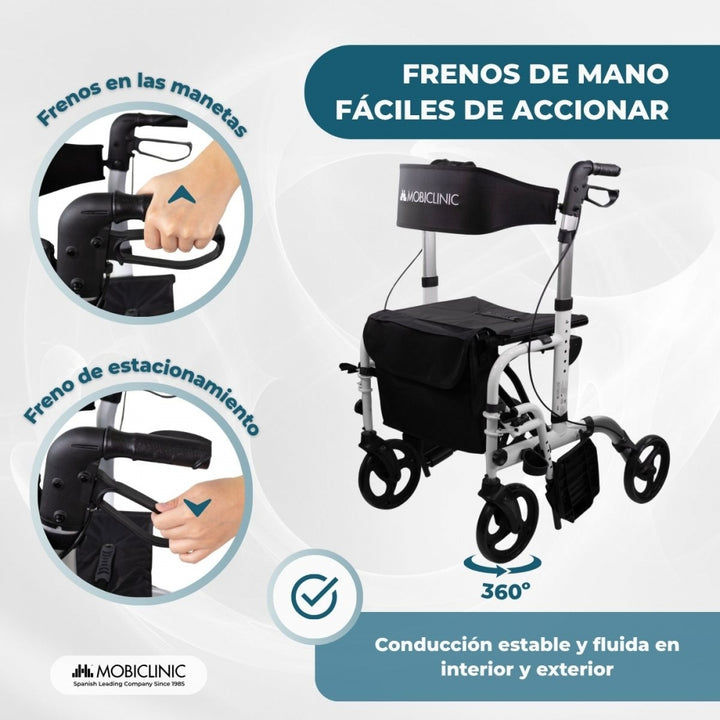 Safety is guaranteed thanks to its lightweight, durable aluminum frame, capable of supporting up to 136 kg. Plus, the handbrakes integrated into the handles are easy to operate, even for people with limited hand strength, providing confidence with every use.