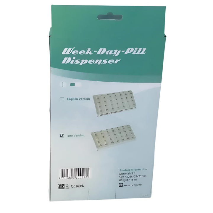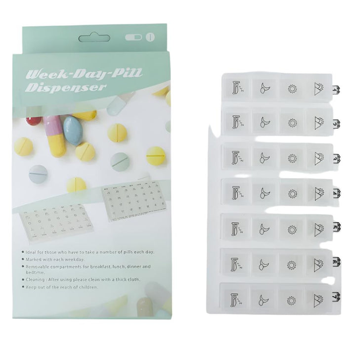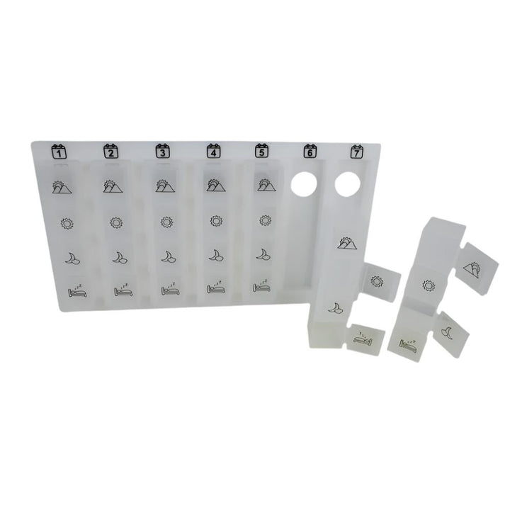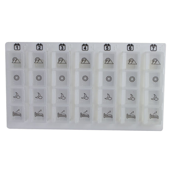 Each container has four divisions with the icon of each time of the day, which are also included in Braille. In particular, they correspond to breakfast, lunch, dinner and bedtime. However, they can be adapted to each patient's needs. Each of the seven containers can be comfortably carried as an individual pill dispenser, so you will be able to take with you only the tablets that you need for one day!